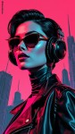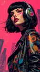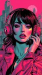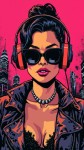 Tech Punk Fashion Woman Icon with Headphones, Pink City Background