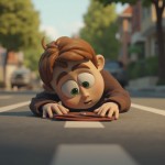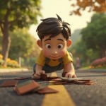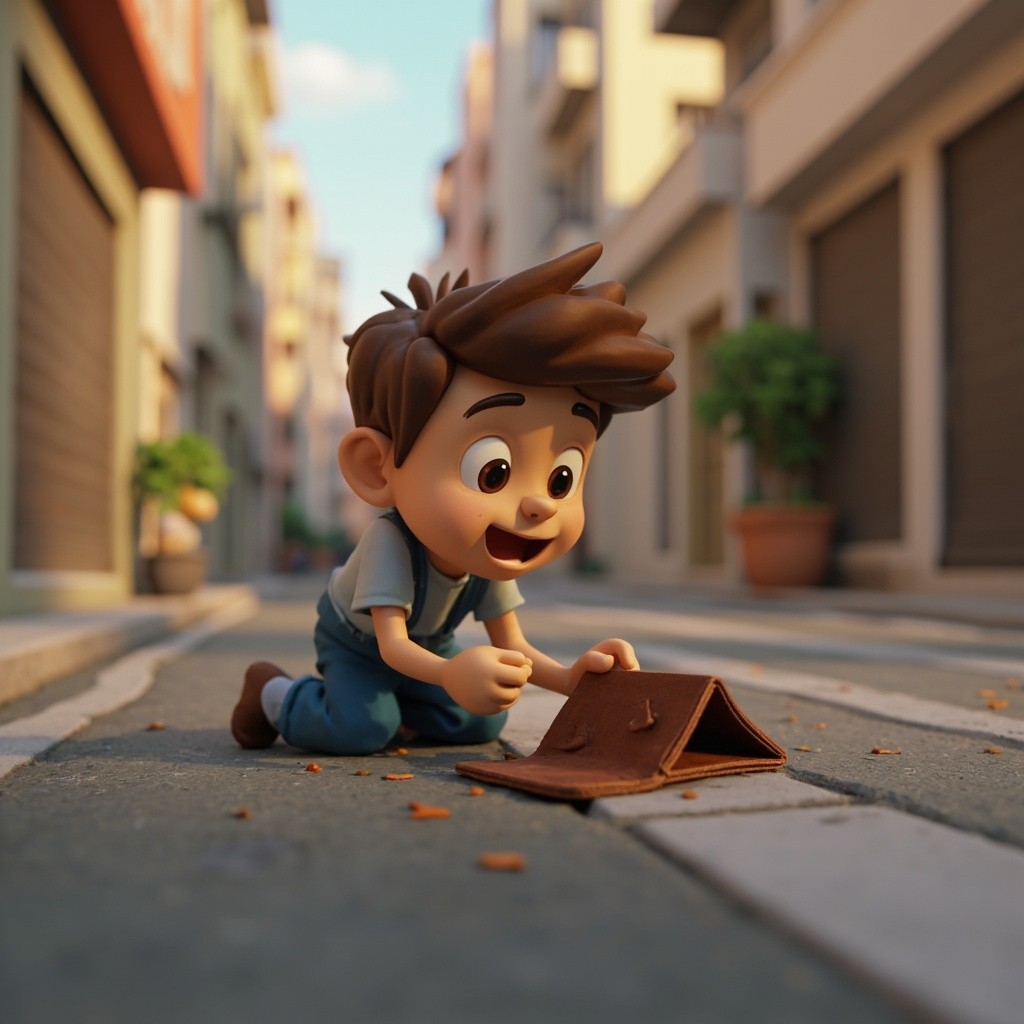 3D Cartoon Scene of Boy Picking Wallet on Road