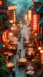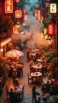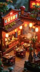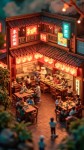 A miniature scene of an anime style Chinese inn restaurant. The character style in the scene is an anime style big head doll, with exquisite depictions of many dining chairs, a dazzling array of dishes, neon billboards, crowds eating and drinking, chefs cooking, steam, and vivid and colorful plants. The screen is filled with the atmosphere of life, warmth, happiness, and harmony. 32K ultra high definition, ultra fine, realistic effects, anti aliasing.