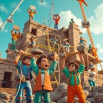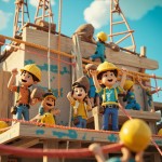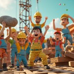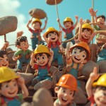 A group of construction workers are working on a building, some of them aredumping stones, some of them are climbing ropes, some of them are pulling ropes, and some of them are raising both hands. The colors are bright and full of childlike fun, presented in C4D modeling style for creative display. The 3D rendering is a medium scene, lively and dreamy, super detailed, high-definition HDR、 Film like composition, emphasizing realistic textures and lighting