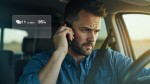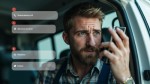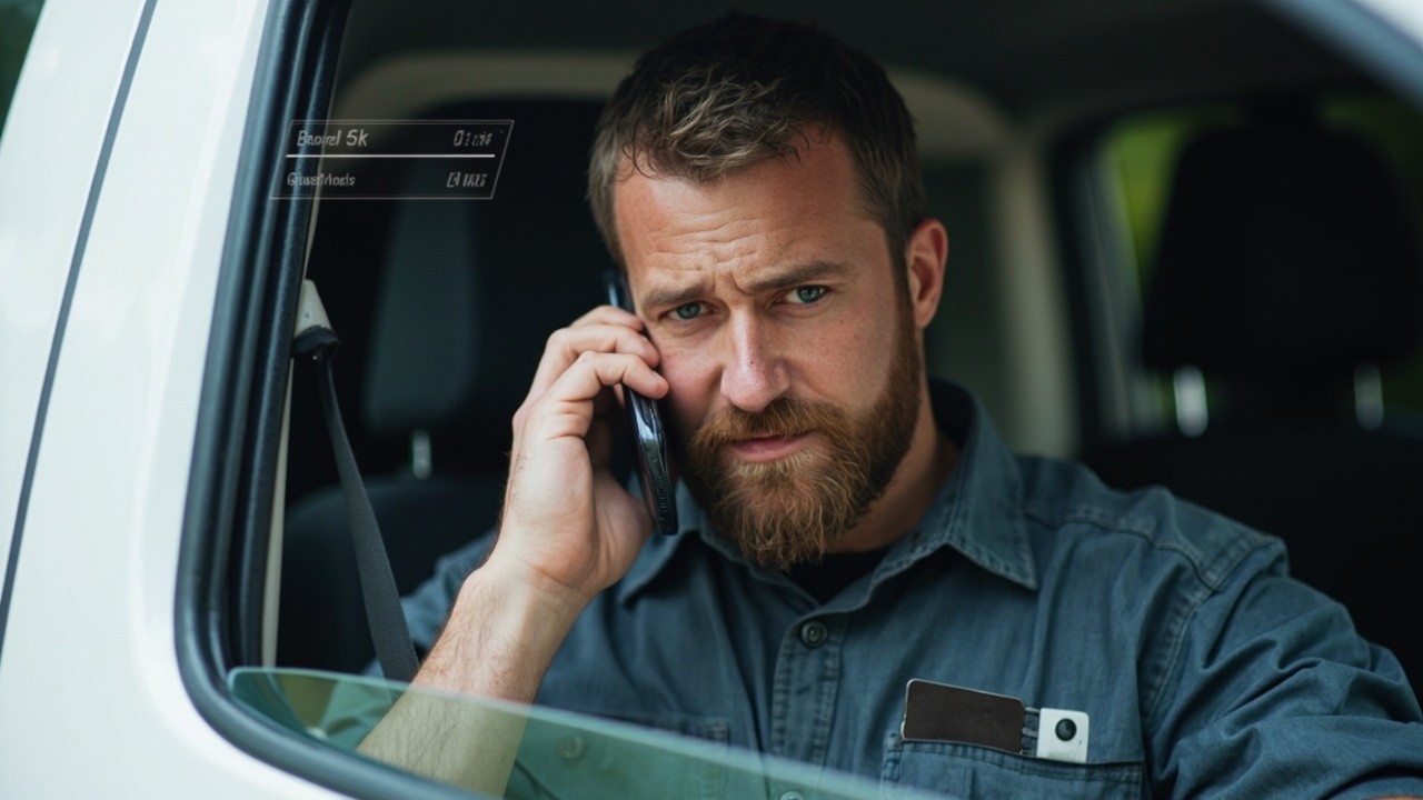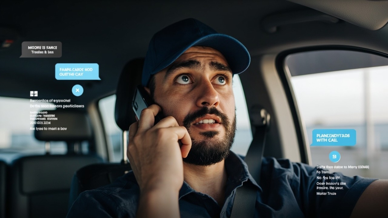 Professional Plumber in Work Van Answering Smartphone with Notification Icons Background