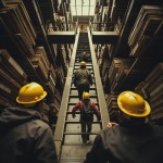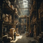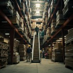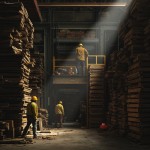 Warehouse Interior with Stacks, People in Yellow Hats, Lifts