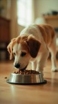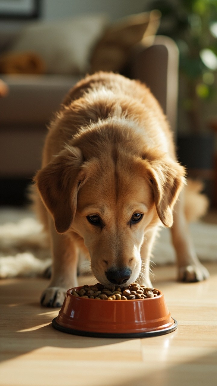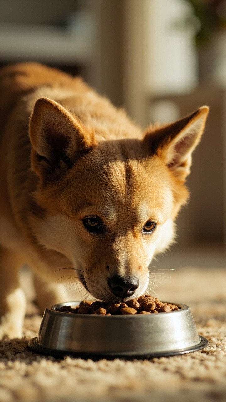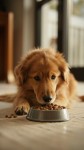 Realistic home interior. A healthy, well-groomed dog calmly eating dry dog food from a bowl on the floor. Natural chewing movements, relaxed posture, focused on food. Clean environment, warm daylight, cozy atmosphere. Close-up and medium shots, smooth camera movement. No mess, no aggression, no human hands in frame. Educational and calm mood. High detail, realistic textures, cinematic lighting.