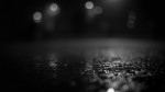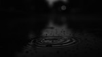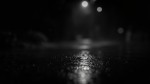 A quiet, moody night scene with gentle raindrops falling on a dark, wet surface. The background is deep black with soft, blurred bokeh lights faintly glowing in the distance. Each drop creates subtle ripples, barely illuminated by dim reflections. Captured in natural monochrome tones using a Canon EOS R5 with a 35mm f/1.8 lens, shallow depth of field, emphasizing texture, contrast, and atmospheric stillness.