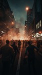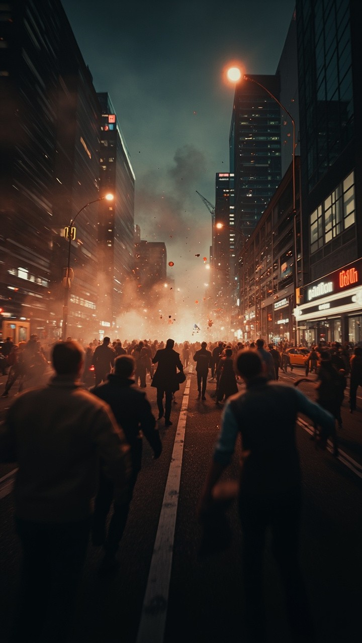 Night Scene of Chaotic City Street with Frightened Crowd and Crashing Cars