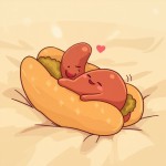 A cute and whimsical illustration of a cartoon-style sausage and a baguette cuddling on a soft, beige fabric surface like a cozy blanket. The sausage has a smiling face and is hugging the baguette lovingly, with simple, expressive features like happy eyes and a cheerful mouth. The overall vibe is warm, humorous, and heartwarming, with a soft, slightly blurred background to emphasize comfort and affection between the two food characters