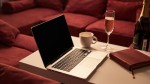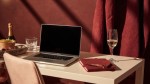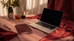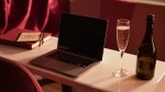 Luxury entrepreneur workspace with a relaxed, celebratory vibe. Laptop open on a minimalist desk or table. Touches of oxblood in the scene — think a wine-colored notebook, fabric, or glassware. Includes a champagne glass or bottle. Lighting is warm and editorial. Overall mood is polished but approachable, blending professionalism with fun. No clutter, soft textures preferr