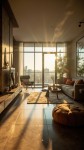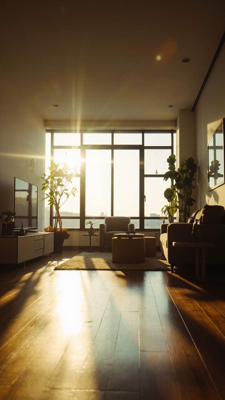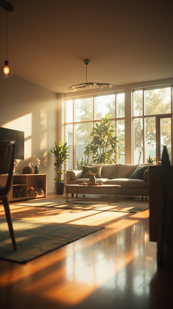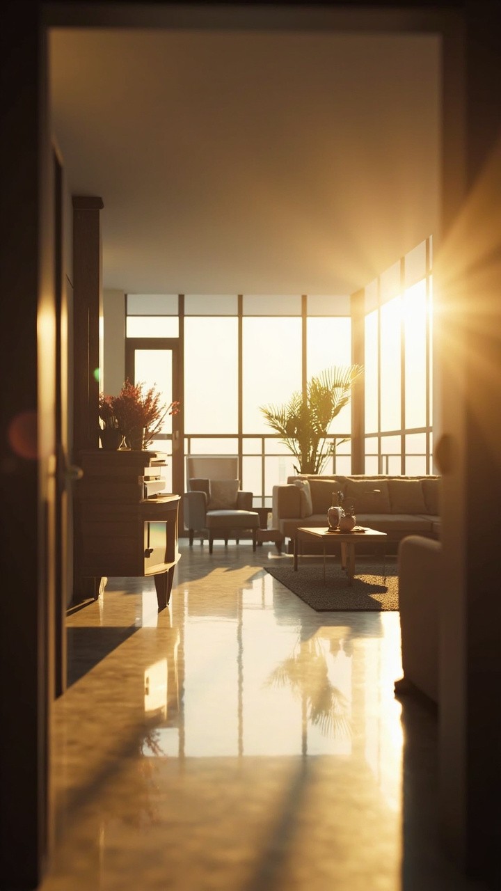 A seamless cinematic tour of a modern apartment. The camera moves smoothly and gracefully, gracefully through the living room, showcasing furniture, decor, architectural details, and polished surfaces. Natural sunlight streams through large windows, casting soft shadows and realistic reflections. Soft ambient lighting enhances the warm and inviting atmosphere. Add cinematic depth of field, subtle lens flares, and subtle motion blur for a touch of realism. A luxurious, professional-quality presentation in ultra-realistic 4K resolution—visually immersive.