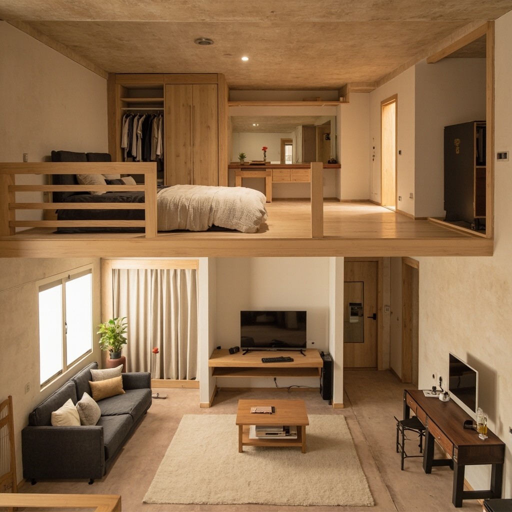Korean Style Loft Bedroom with Gaming Setup and Makeup Table