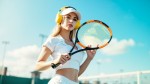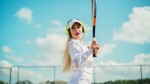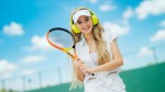 A very pretty young woman with light pink lip gloss and makeup is holding a tennis racket, wearing bright yellow headphones. She is standing on a tennis court with a blue sky and white clouds in the background. The woman is wearing a white sports shirt and matching shorts, with a white baseball cap covering her head. She has long, thick, blonde hair and is looking straight at the camera with a confident expression. The tennis racket is orange and black, and she is holding it with both hands.
