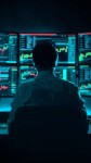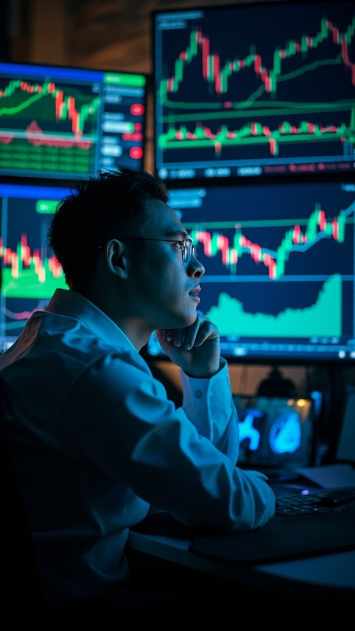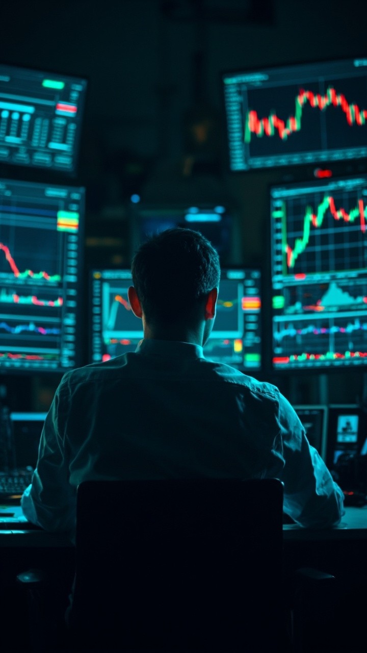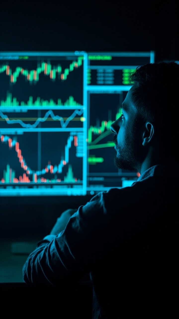 Professional Trader Analyzing Glowing Screens with Charts, Neon-Lit Dark Room