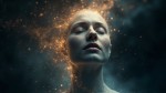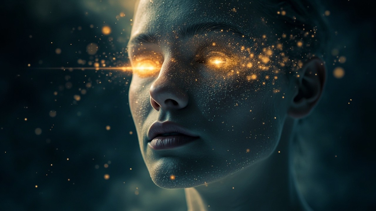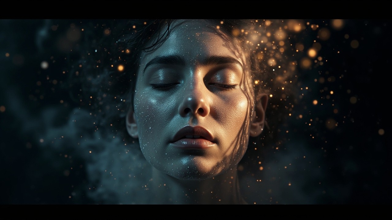 Ethereal cosmic human face emerging from darkness, skin made of stardust and glittering particles, glowing celestial light flowing through the face, deep space background, nebula colors, divine feminine energy, calm transcendental expression, luminous particles, ultra-detailed, cinematic lighting, spiritual awakening, higher consciousness, surreal and dreamy, soft motion feeling, meditation and breathwork visual