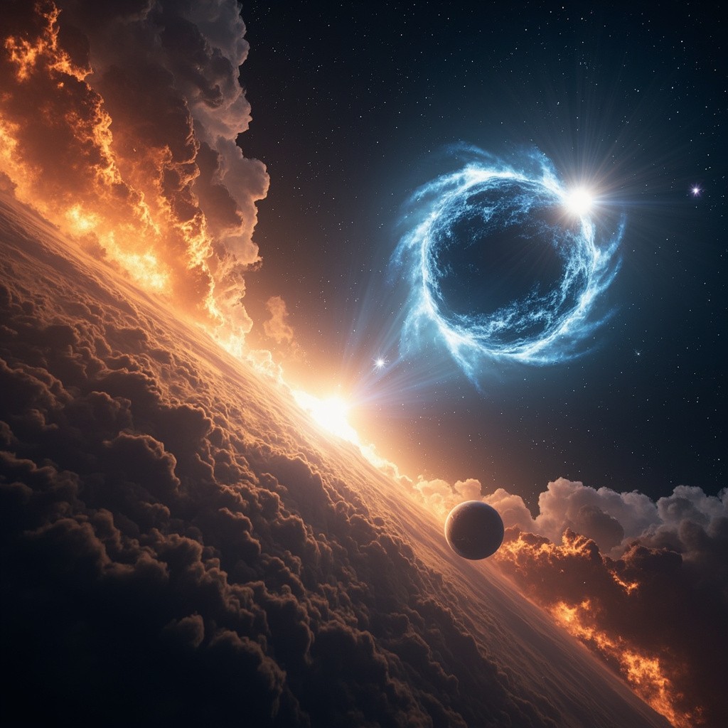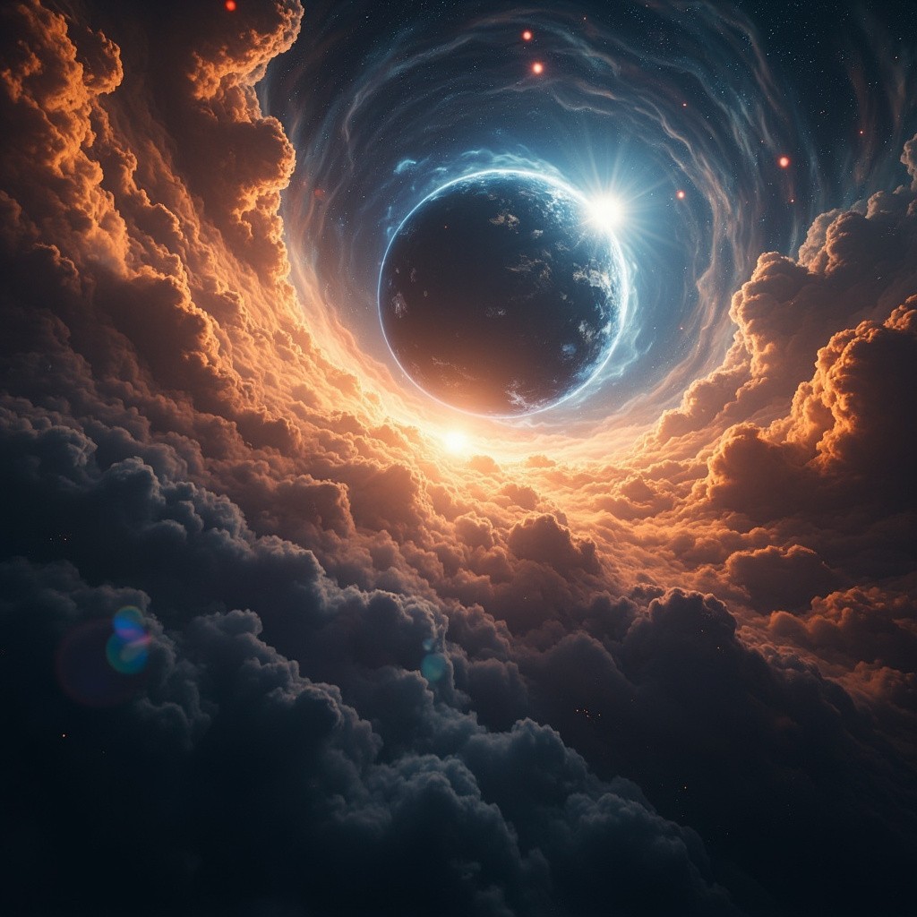 A cinematic journey through the universe — glowing orange and blue nebula clouds moving in slow motion, electric energy currents flashing between them, camera flying through cosmic dust, then a glowing black hole forming in the center, surrounded by swirling blue light and lens flares, followed by a stunning view of two planets aligning with a bright star behind them. Ultra-realistic, 8K quality, deep contrast, film lighting, HDR glow, Unreal Engine render, slow camera movement, epic sci-fi atmosphere, emotional cosmic music vibe, aspect ratio 9:16.