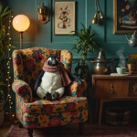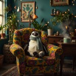 An adorably surreal, bohemian living room scene where a well-groomed penguin in a tiny knitted scarf lounges on a vibrant, floral-print armchair. The room is decorated with indoor plants, retro lamps, and quirky wall art on dark blue-green walls. Fairy lights twinkle softly, and a steaming mug sits on a nearby vintage wooden side table. The overall vibe is cozy, playful, and slightly magical.