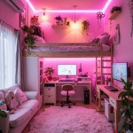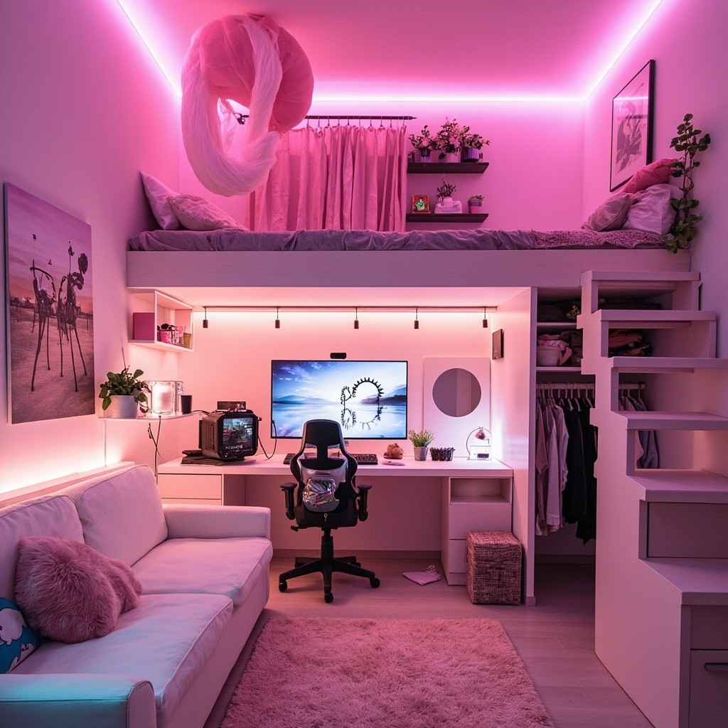 Cozy aeshetic korean style girly pink with fairy pink light big loft bedroom top floor has bed and closet for clothes and bottom floor has gaming setup sofa and tv and makeup table. The gaming table and makeu table are around the at the wall and the sofa is to the left. The sofa is white comfy. The room has many decorations like plushies and blankets and plants