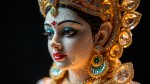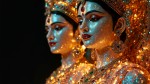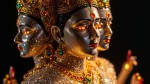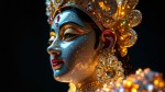 A hyper-realistic close-up, half-body depiction of Goddess Gayatri made entirely of radiant crystals and shimmering gemstones. Her five serene faces are carved from multifaceted crystal, glowing softly and reflecting light like precious gems. Her crown and ornaments are crafted from diamonds, rubies, and sapphires, exuding opulence. The eyes gleam like emeralds and yellow sapphires, radiating wisdom and divine grace. Her upper body is adorned with intricate jeweled armor and a radiant crystal saree. The background is deep black, styled like a luxurious fashion editorial elegant, high-contrast, and dramatically lit. Shot in ultra-high definition, the image captures every facet and glow, evoking sacred beauty and cosmic power.