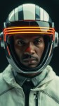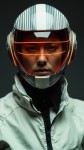 Close-up portrait of a person wearing a futuristic, technological full face helmet. The helmet is sleek, metallic gray and white, with 1970s retro-futuristic fashion, modular abstract stripe pattern and glowing orange accents, especially prominent around the visor area, with a Curvilinear Stripes, Bauhaus Revival. The visor has horizontal orange stripes with red lighting beneath it. The person wears a white, form-fitting, technical-looking jacket over a black collared shirt. The jacket has subtle texture and seams, highlighting its futuristic design. The lighting is dramatic, highlighting the metallic details of the helmet and the subtle shadows on the person's face and clothing. Studio shot, front-facing, close-up. Dramatic lighting emphasizing the texture of the materials. Cyberpunk aesthetic. Photorealistic, extremely detailed.