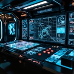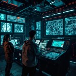Cyberpunk Control Center with Glowing Panels and Digital Maps