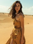 High-fashion editorial photo of a stunning woman with very long, dark brown loose curls, piercing blue eyes, and full lips. She wears a sand-colored, one-shoulder silk gown with a high slit and flowing train, cinched at the waist with a minimal leather belt. Set in a vast desert landscape with sun-scorched earth and distant dunes. Harsh sunlight casts dramatic shadows. Vogue-style photography with cinematic composition, wind-blown hair, confident pose, and a sense of quiet power.