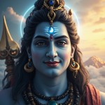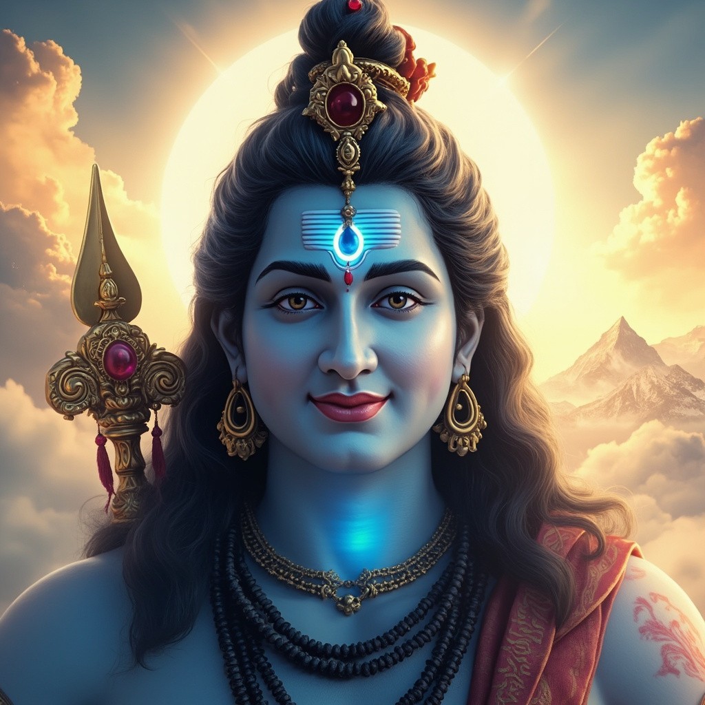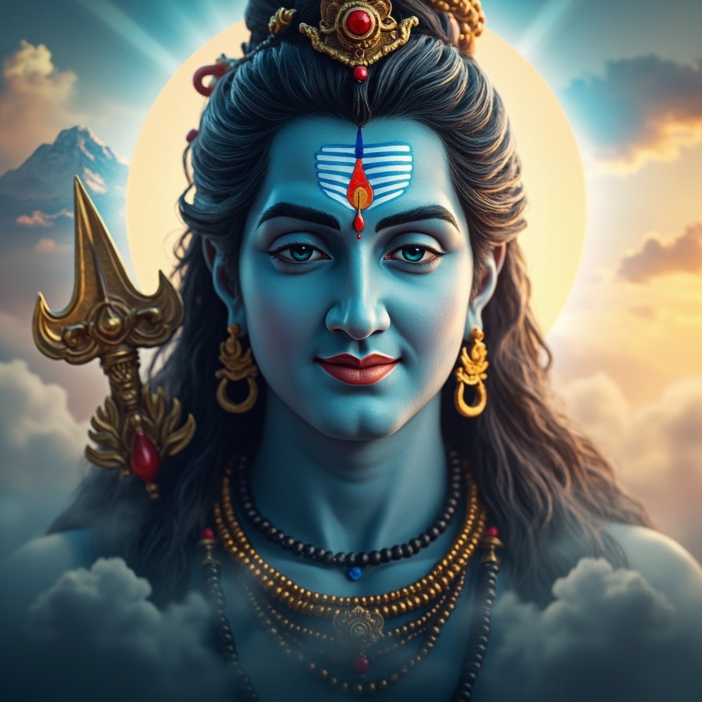 Lord Shiva divine portrait, bright and clean devotional look, peaceful smile, radiant blue aura, glowing crescent moon, clear third eye mark, blue Neelkanth throat, Trishul with Damru, soft clouds and Mount Kailash background, warm golden sunlight, high brightness, ultra-sharp face details, vibrant colors, devotional art style, ultra HD, cinematic, thumbnail-friendly composition, spiritual energy
