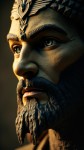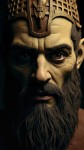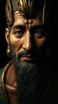 a hyper-realistic image of a Sumerian Anunnaki face. Focus on ancient, otherworldly features such as strong, angular facial structures, deep-set eyes with an intense, almost mystical gaze, and intricate, ornamental details like a well-groomed beard or headpiece resembling Sumerian royalty or gods. Incorporate subtle elements of extraterrestrial or divine influence, such as slightly elongated features or unusual skin textures, while maintaining a human-like resemblance. The lighting should highlight the regal and mysterious nature of the Anunnaki, evoking a sense of both ancient wisdom and power.