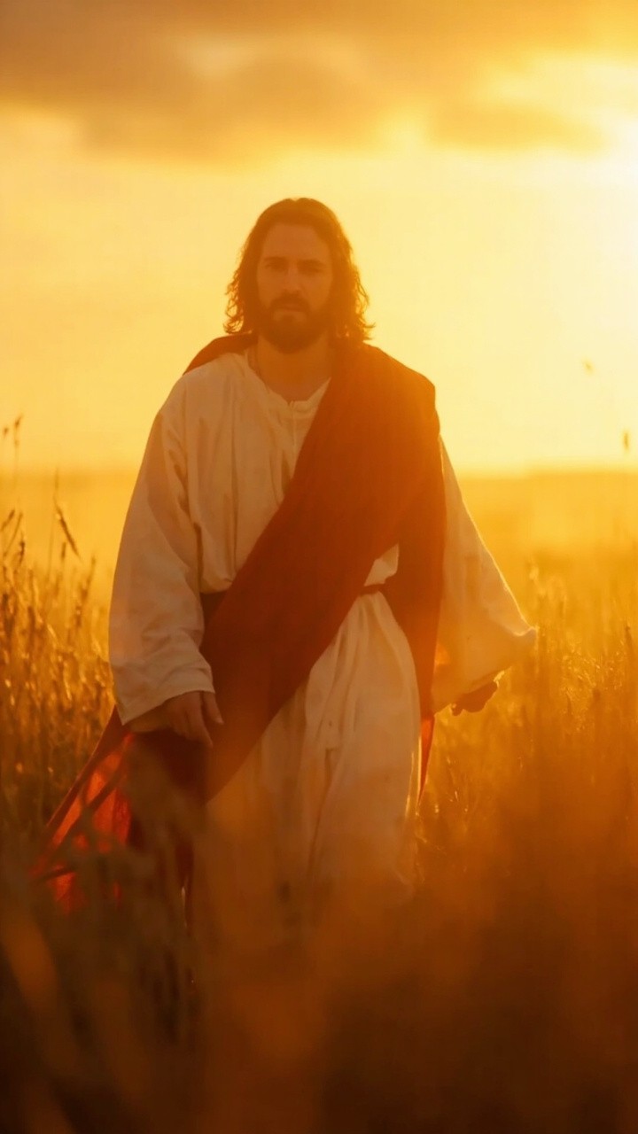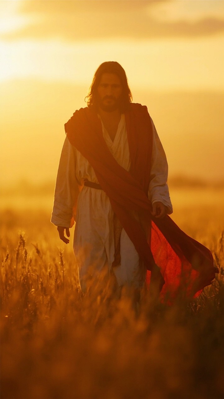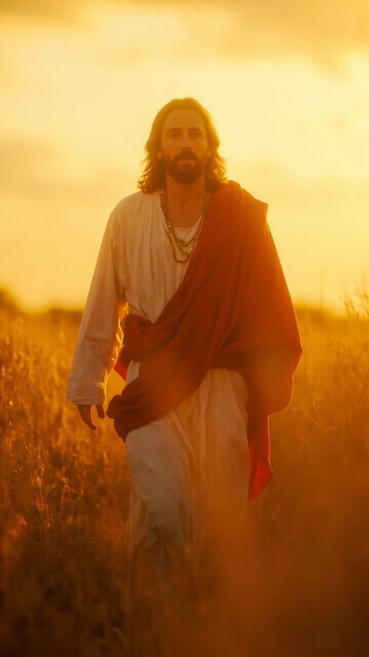 A cinematic, high-definition vertical video of Jesus Christ walking through a golden wheat field during sunset. He is wearing traditional white and red robes that flow in the wind. The lighting is soft and divine (god rays), creating a peaceful and holy atmosphere. 4k, hyper-realistic, slow motion, 9:16 aspect ratio.