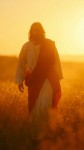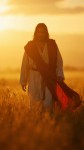Jesus Christ in White and Red Robes Walking Through Golden Wheat Field at Sunset