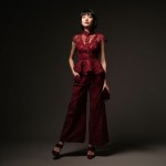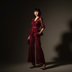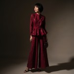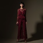 Show a full body shot in a studio with dramatic lighting. A 40-year-old tall Asian woman with black hair in a short bob haircut with bangs and makeup. She is wearing a deep red eyelet peplum blouse over a pair of wide-leg, matching eyelet palazzo pants to cover the top of her shoe, accompanied by high-heeled sandals in deep wine and a small, rectangular handbag with short handles, also in deep wine.