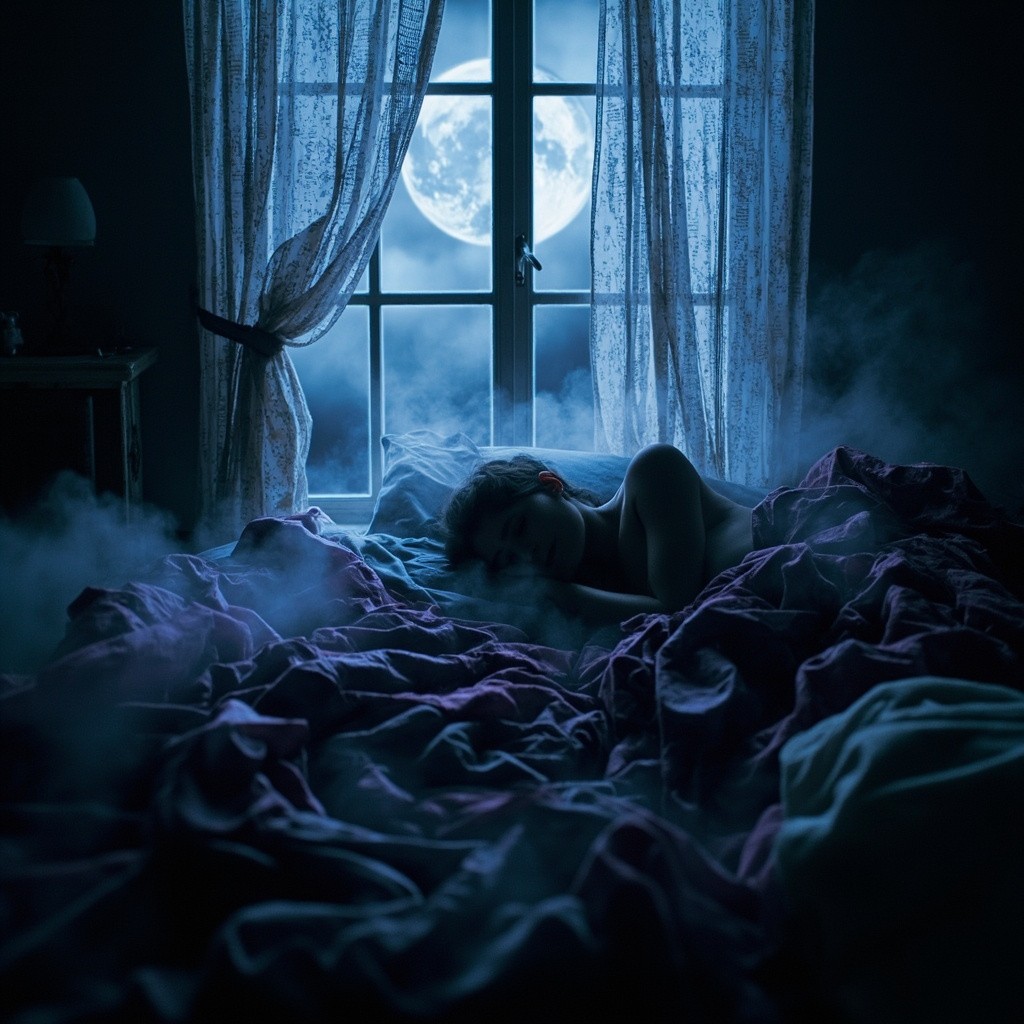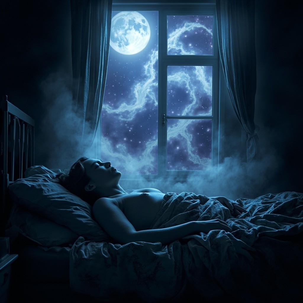 A silhouette of a person sleeping fitfully in a tossed bed. The bedroom window is open, and moonlight streams in, transforming into a mindflow attack, with a flowing river of stench that surrounds the sleeper's head, causing a bad dream of the day's stress. The atmosphere is uneasy and magical. Style: Dreamlike, ethereal, magical realism, with a color palette of deep blues, purples, and silver.