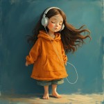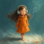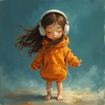 "A dreamy digital painting of a young girl with long, flowing brown hair, wearing a cozy oversized orange hoodie and large white headphones, standing barefoot on a textured ground. Her eyes are closed and she appears to be lost in the music, with a peaceful expression. The background is dark blue with subtle texture, and the brush strokes are soft and artistic, resembling a storybook illustration