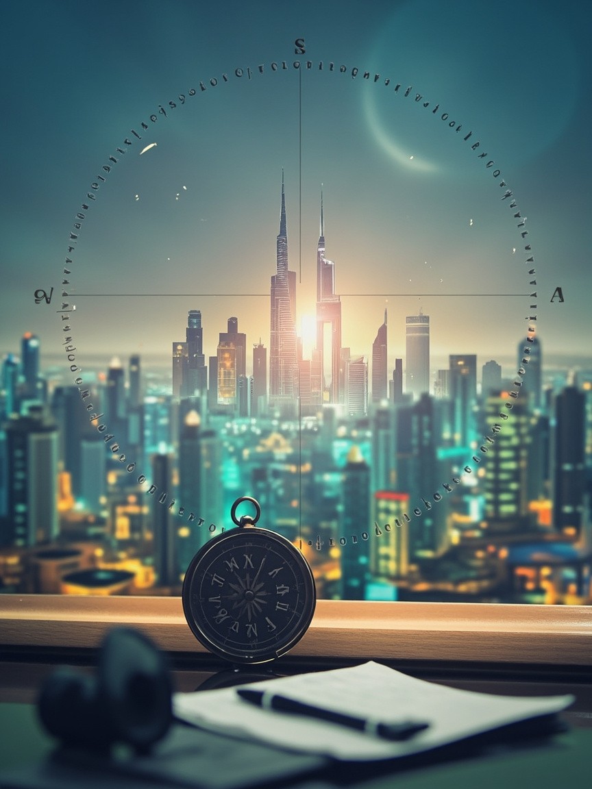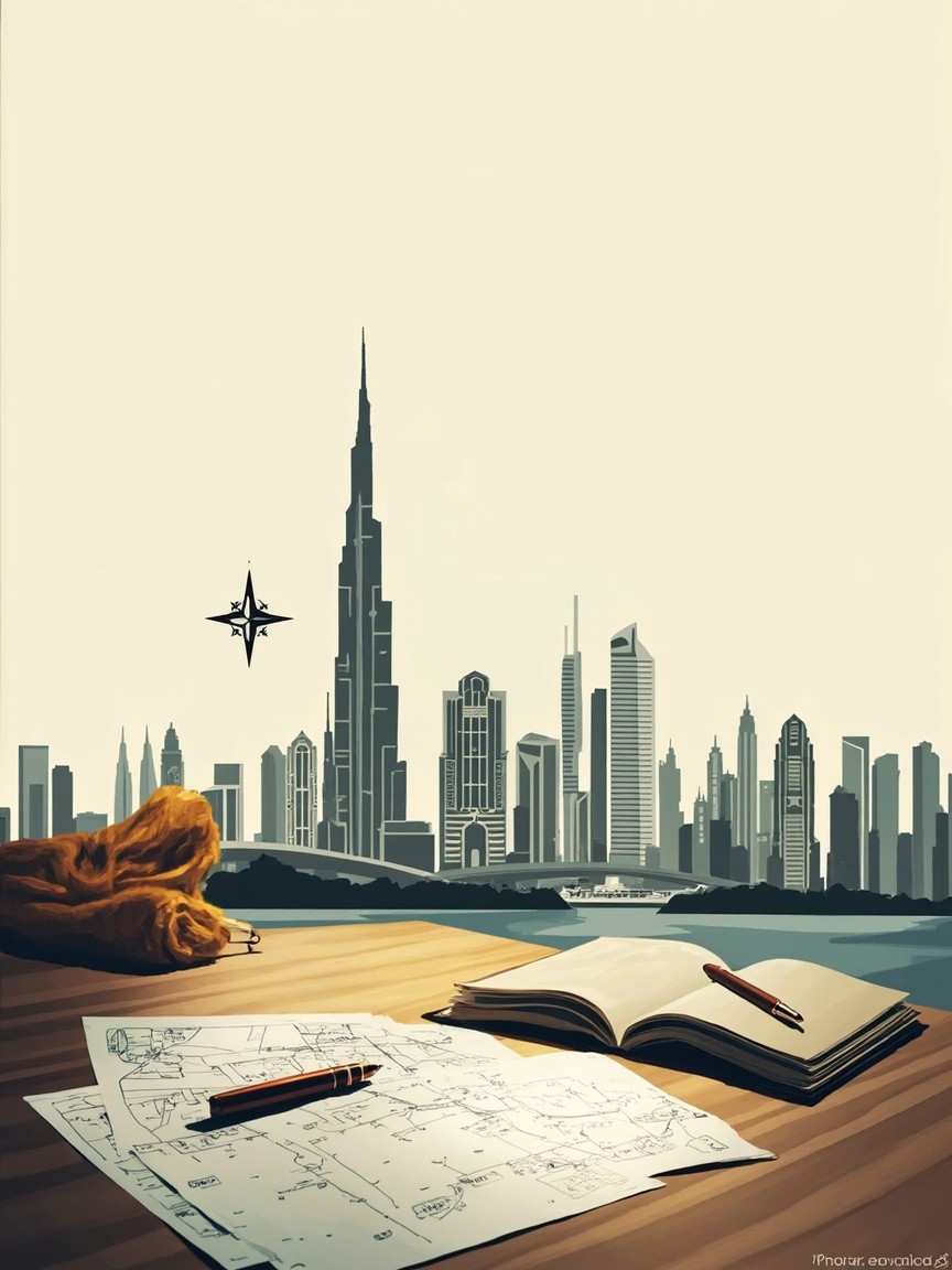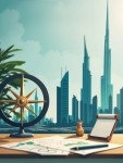 Dubai Skyline Image with Compass and Map Icon on Elegant Table with Pen and Documents