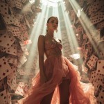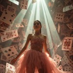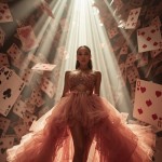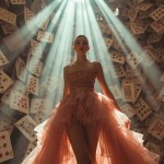 Without changing my facial features and face. remove my earrings. Created me the same page on attachment 100% unchanged. A stylish woman wearing a vibrant dusty rose ensemble o0 strapless embroidered crop top with intricate beadwork and a matching high-low skirt made of multiple layers of sheer flowing tulle or chiffon creating a ruffled oluminous effect. stands confidently pose like a model in a surreal, towering environment made entirely of giant playing queen cards. The cards are stacked in massive columns reaching toward the ceiling, with some floating and tumbling in mid-air. Beams of dramatic light stream down from above, illuminating the woman and casting dynamic shadows through the layers of cards. Ultra-detailed, photorealistic lighting, depth of field, 8K quality.