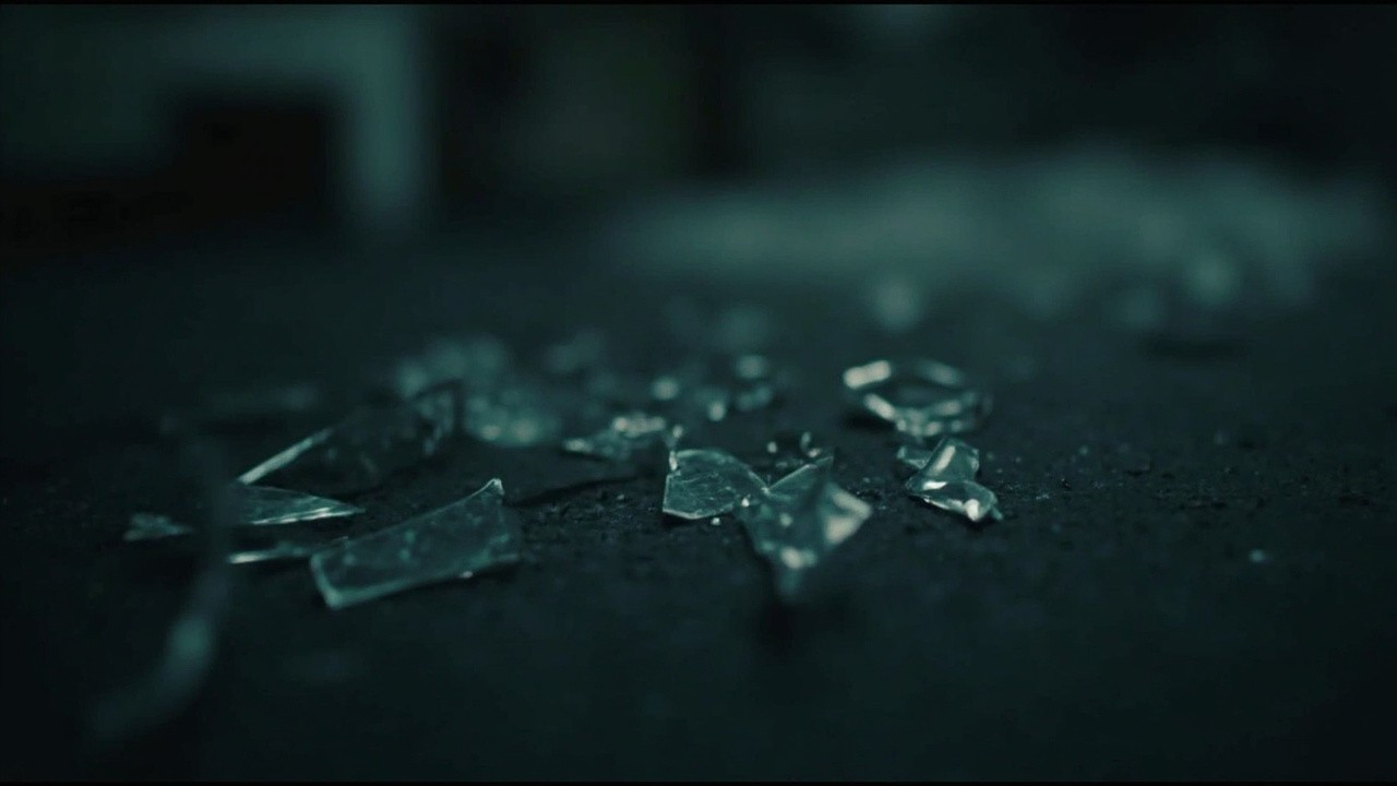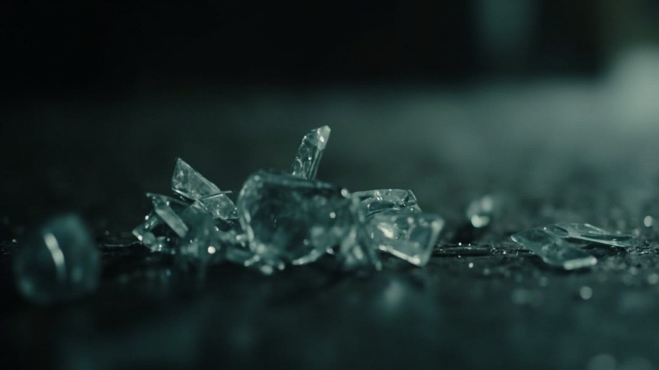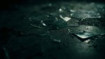 Close-Up Shattered Glass on Dark Surface with Soft Light Reflections