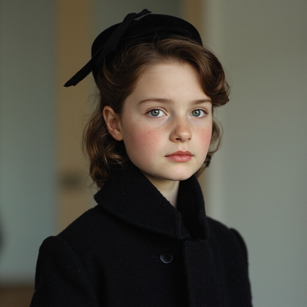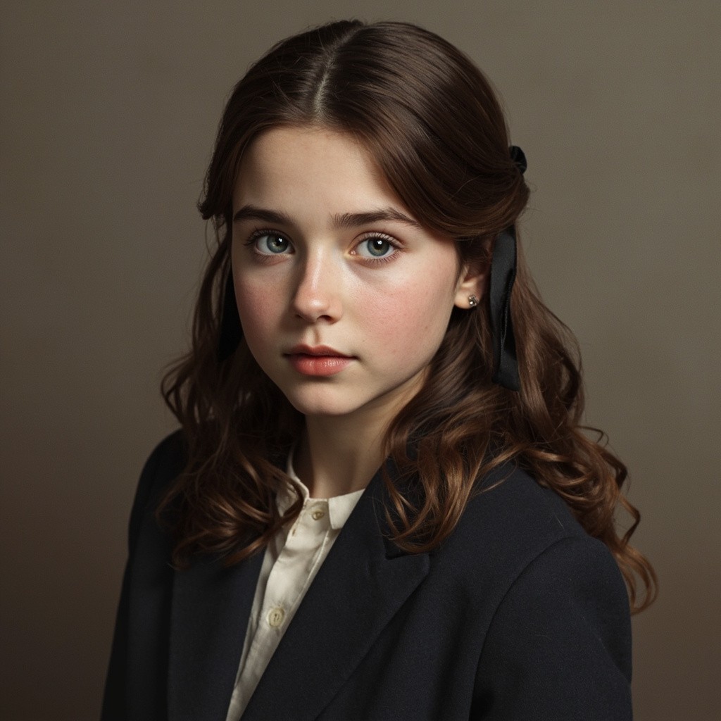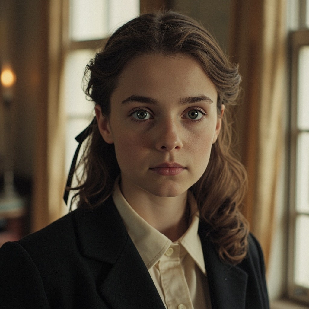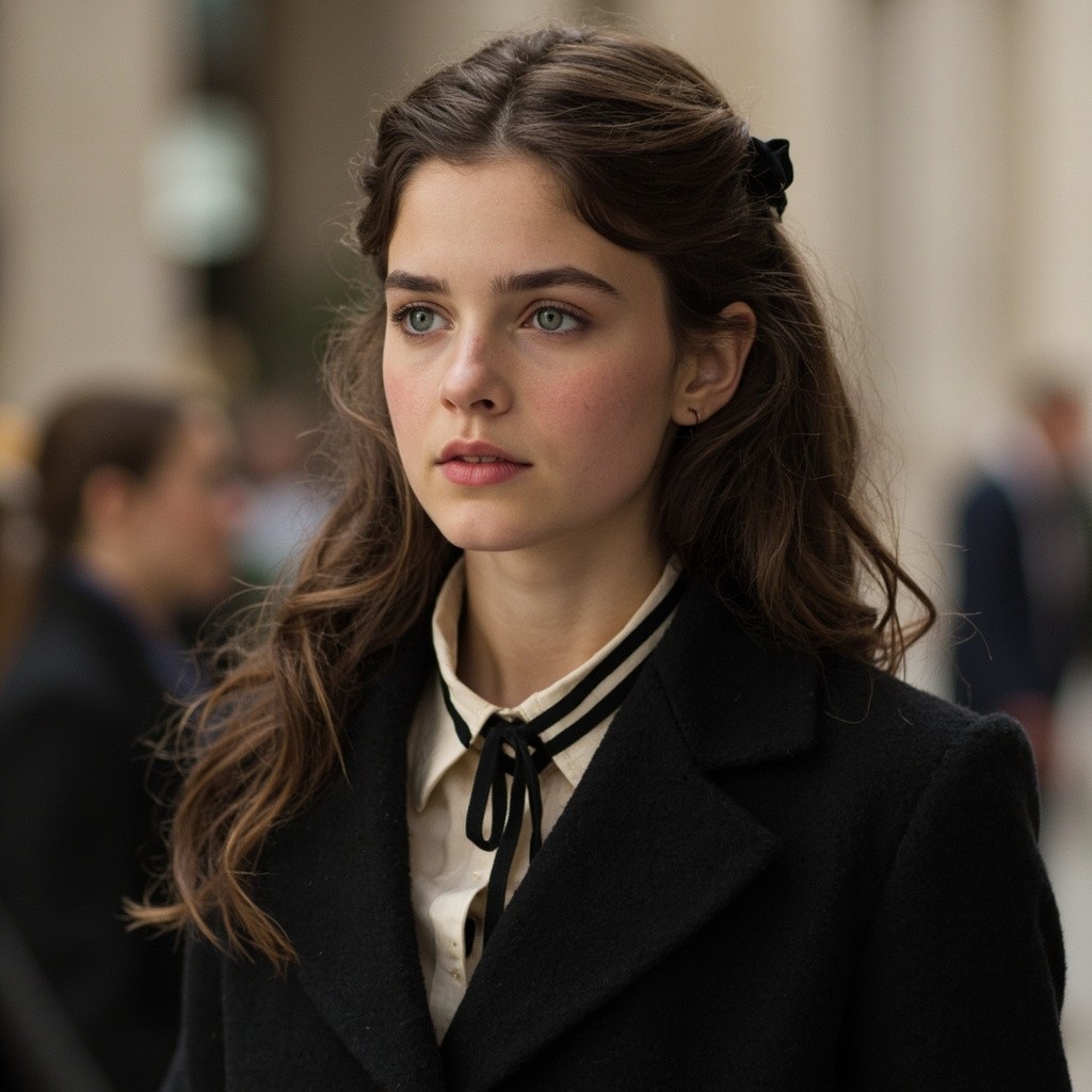 A girl of average height, perhaps slightly shorter, with a slim build and steady posture. Her hair is a deep chestnut brown, long and naturally wavy, usually worn loose or tied back with a simple black ribbon. Her eyes are gray-blue, observant and often unreadable,. she doesn’t wear much makeup — just enough to look polished. Her style leans toward understated elegance: crisp blouses, tailored skirts, soft wool coats in neutral tones. She favor black, cream, navy. I despise seeming desperate for attention