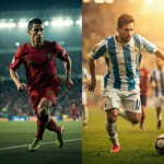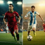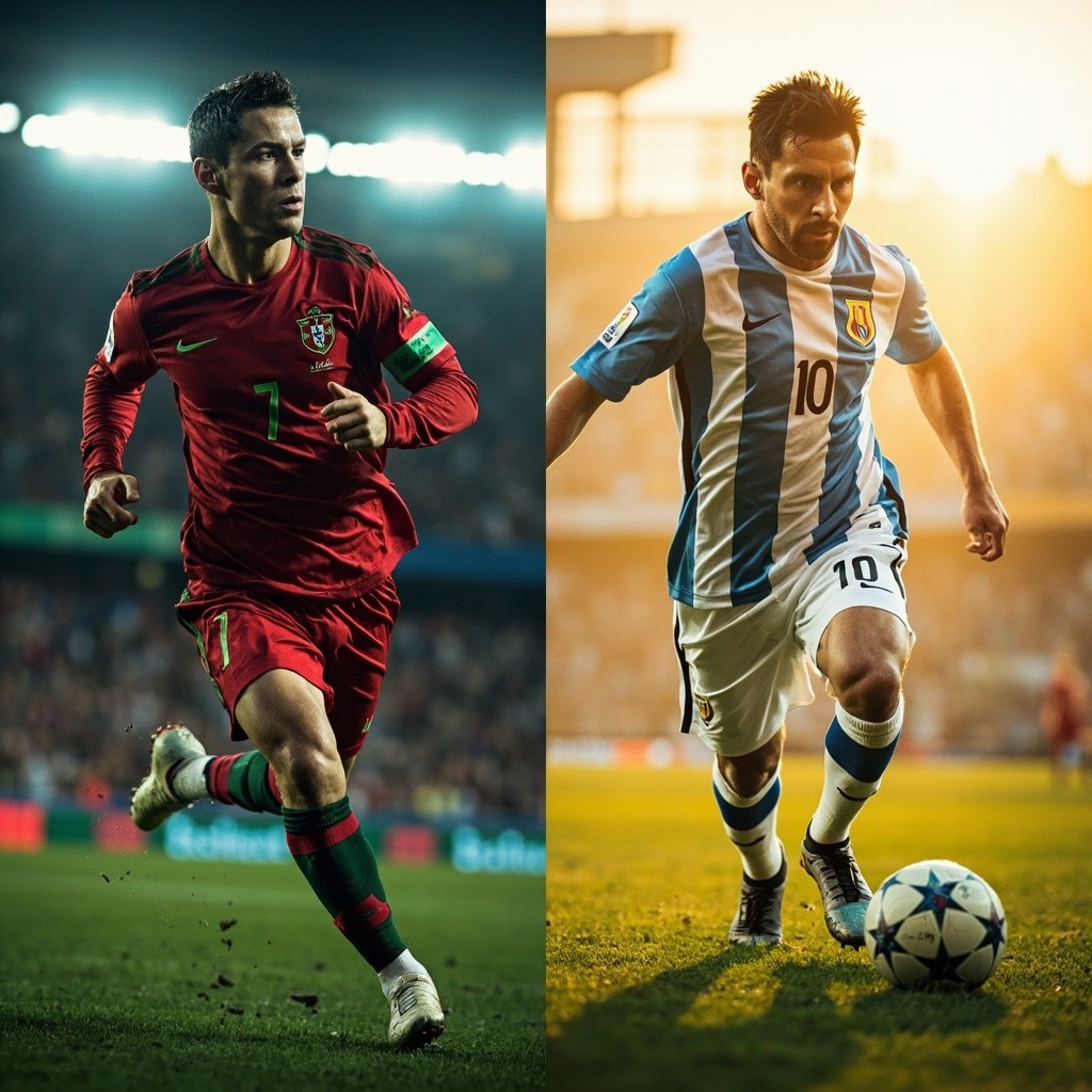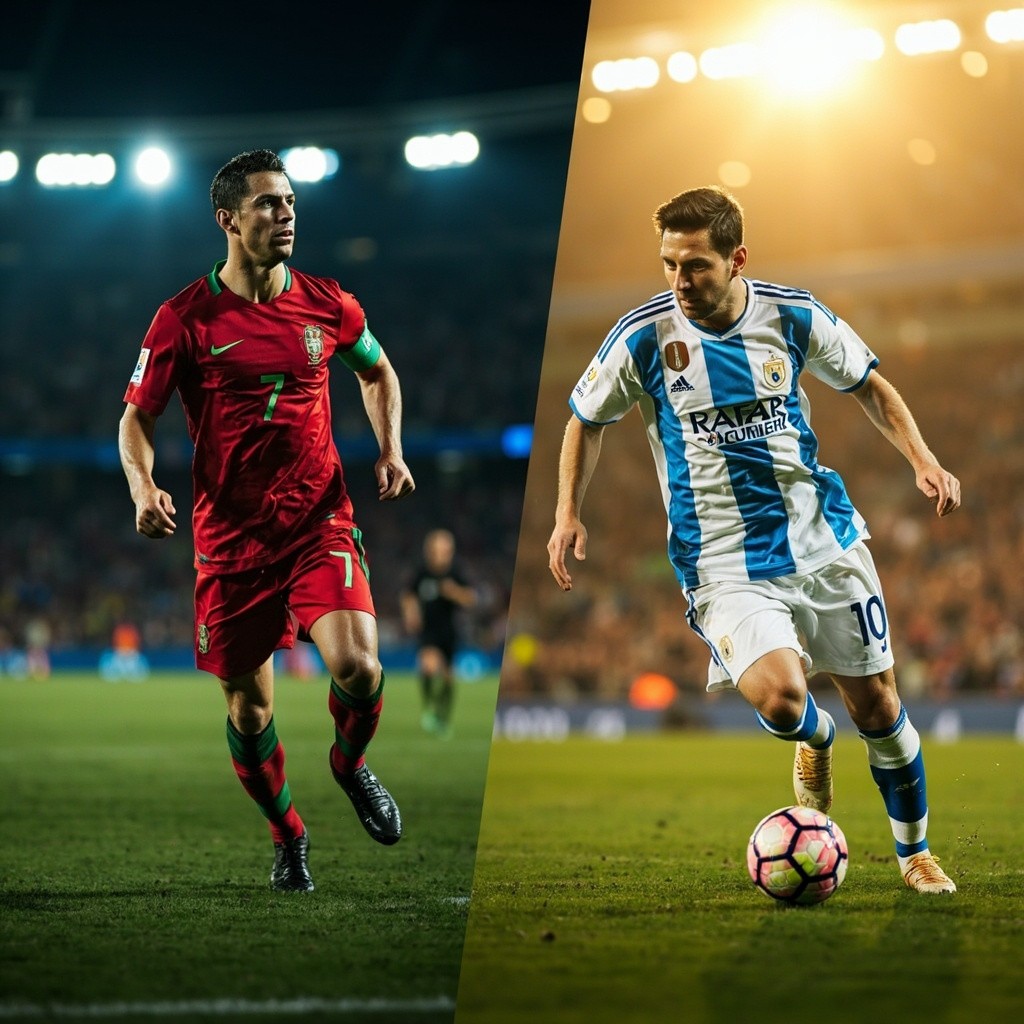 Cristiano Ronaldo and Lionel Messi Split-Screen Action in Stadium