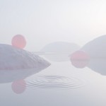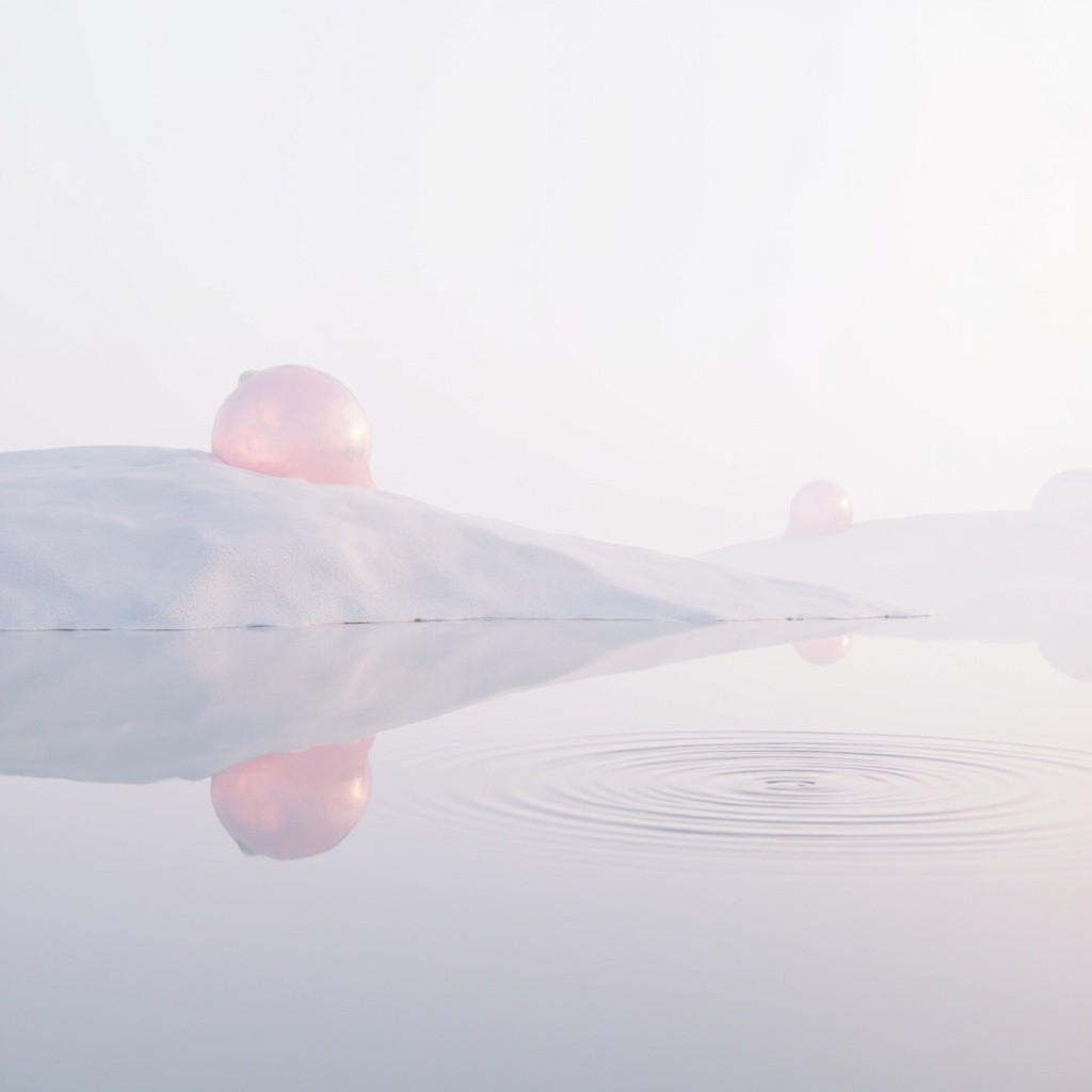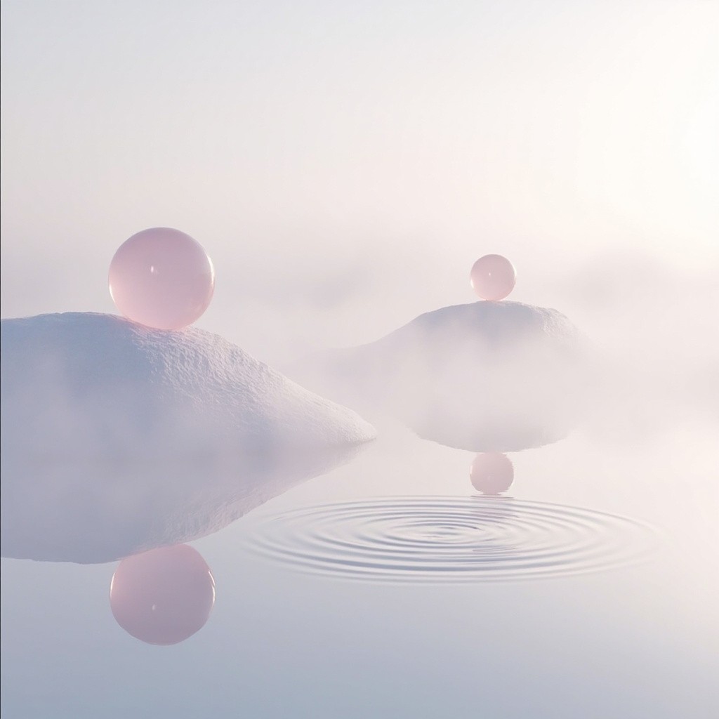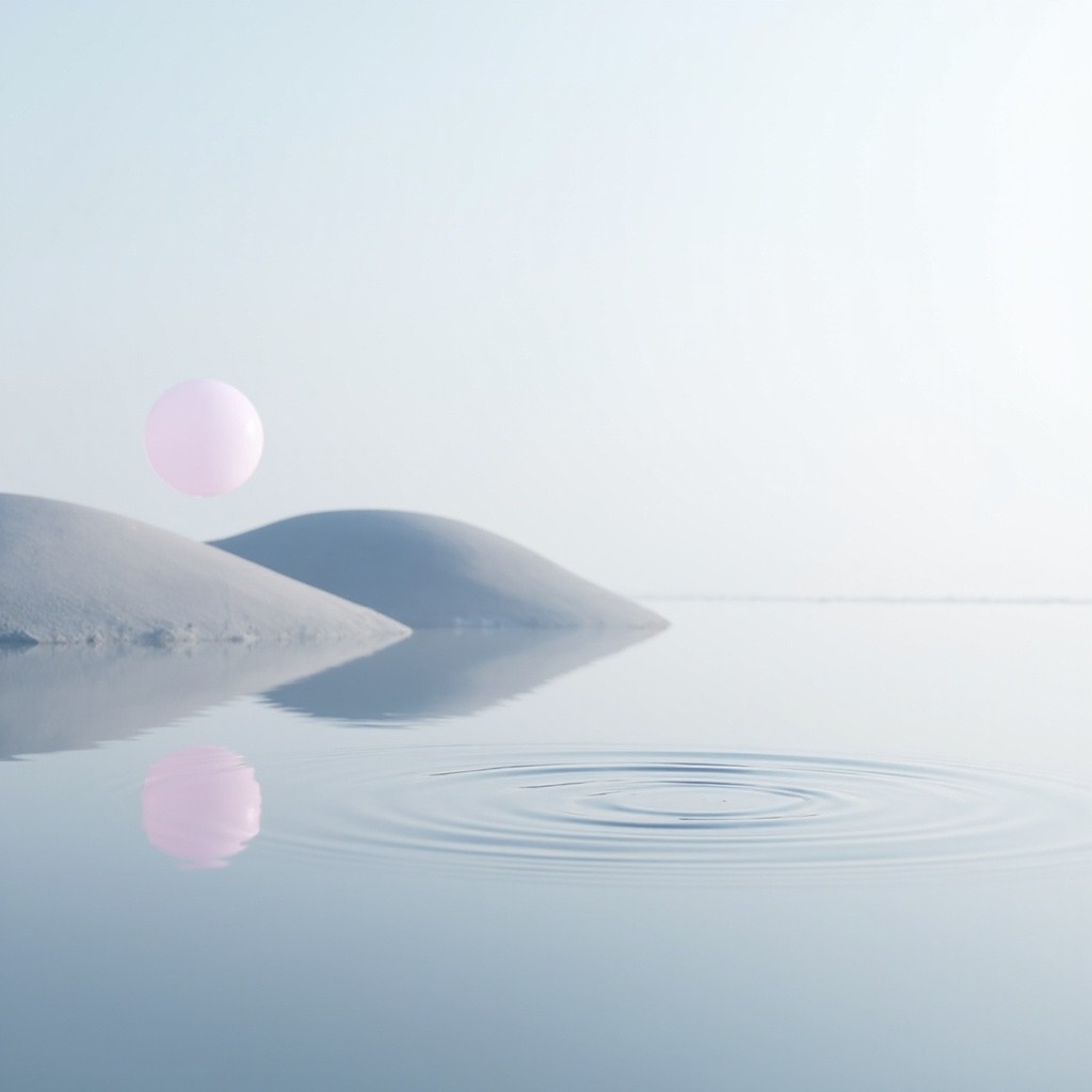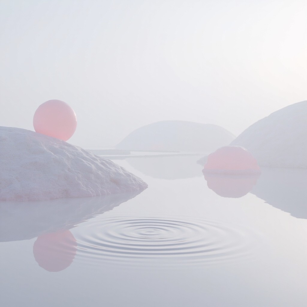 an ethereal, ultra-minimalist photograph of a calm, reflective water landscape. The scene is dominated by two very large, smooth, undulating fabric-like hills in the misty background, positioned as in image_1.png. The number of floating spheres is strictly limited to exactly two: one large translucent pink sphere floating above the left hill, and one smaller translucent pink sphere floating above the far right bank. The entire foreground water is perfectly still, except for a single, perfect concentric circular ripple structure. This single ripple is positioned distinctly in the right-center foreground area, not at the edge. Soft, diffused hazy sky, soft and even studio lighting, high resolution, photorealistic but dreamlike --ar 4961:3508 --stylize 100 --v 6.0