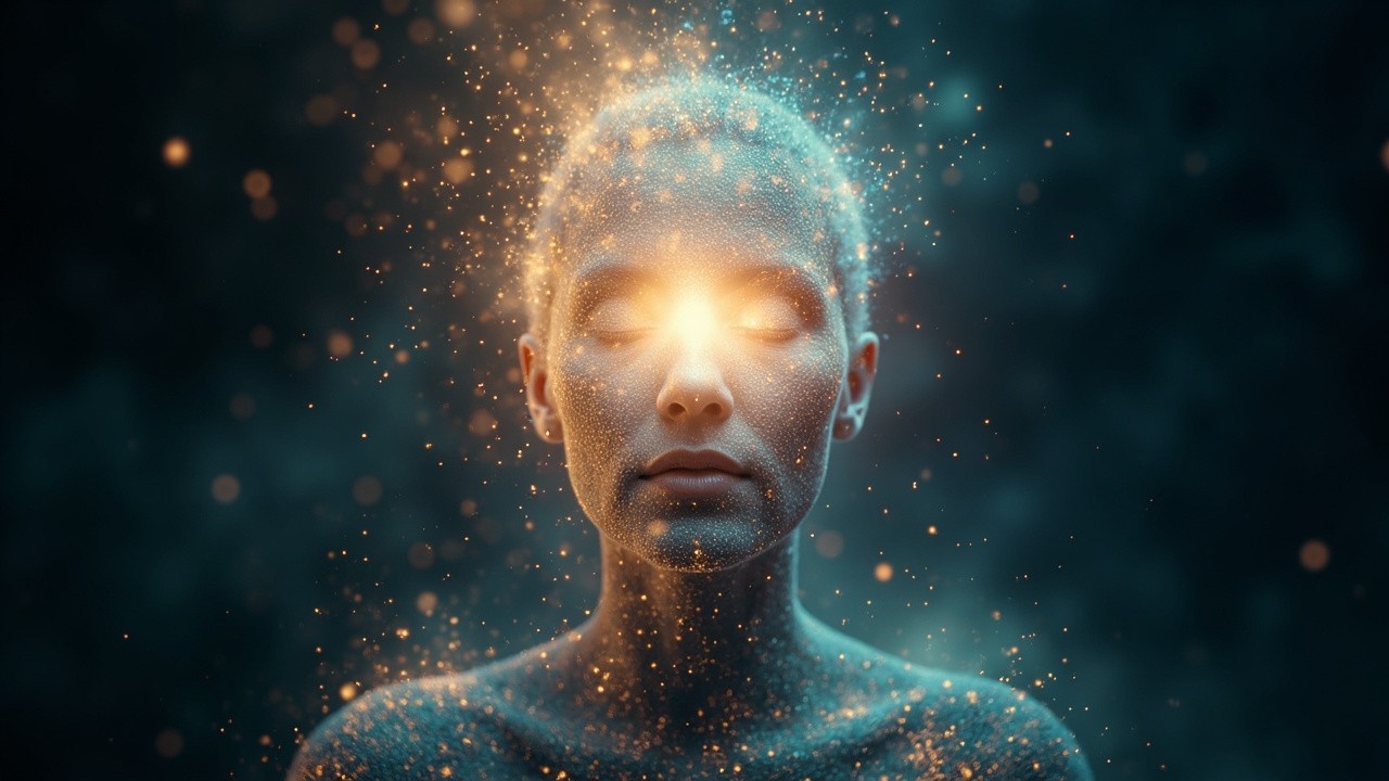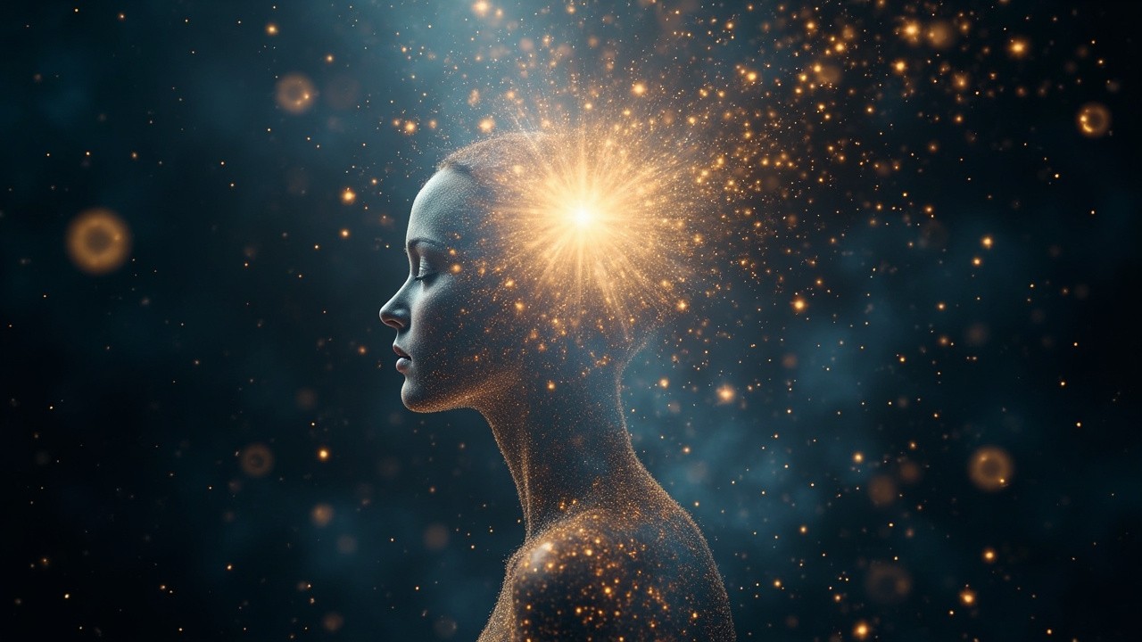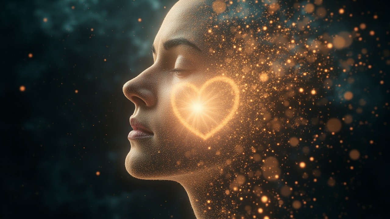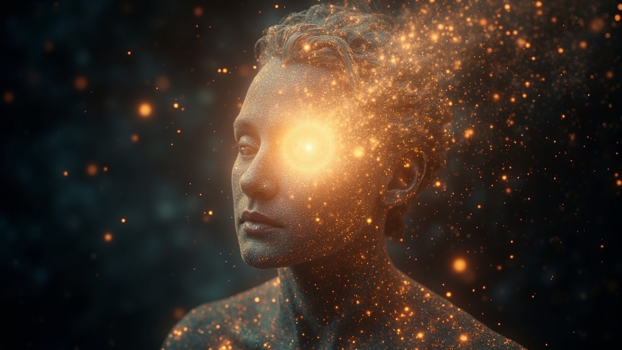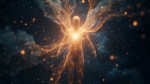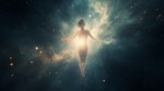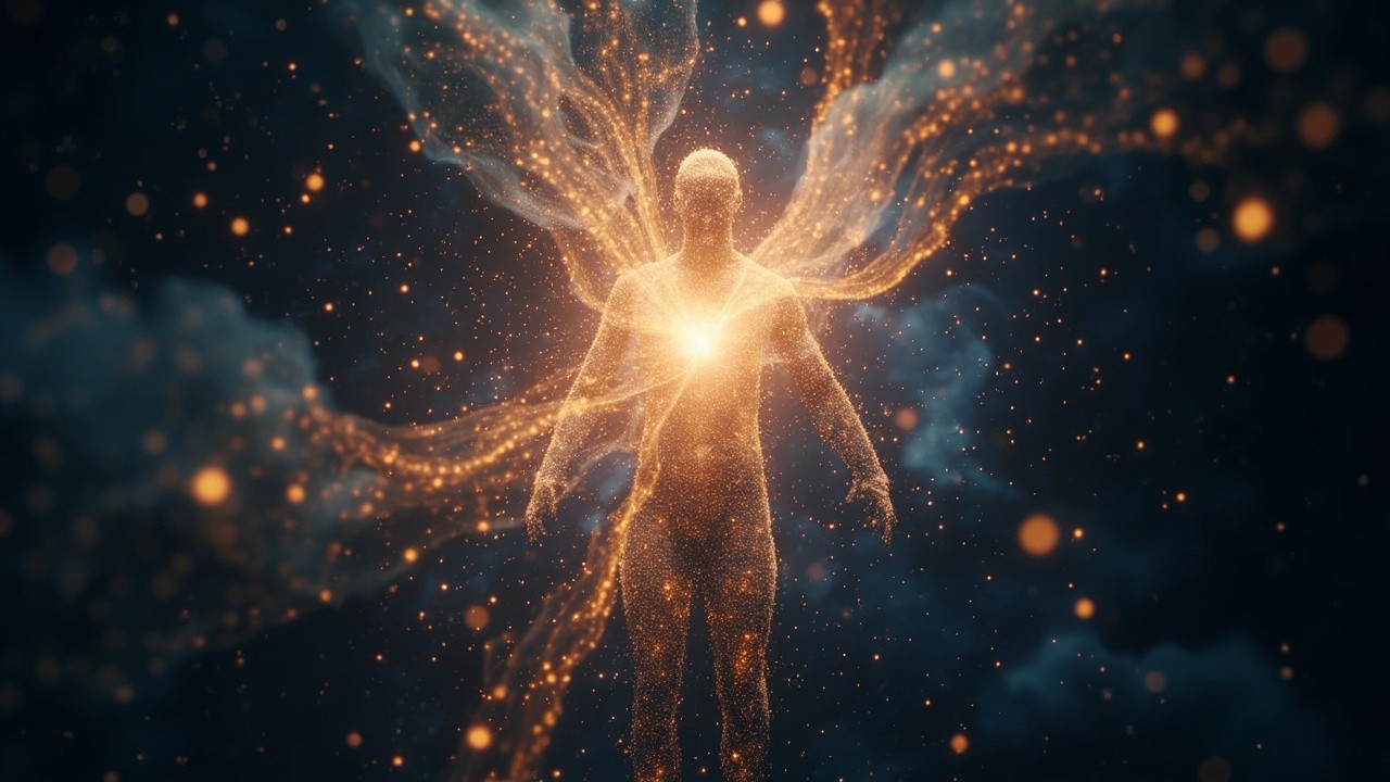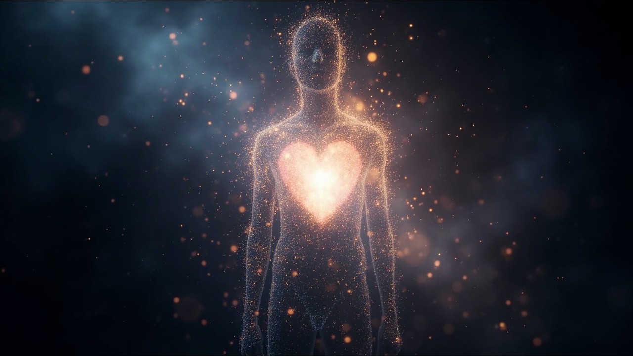 Abstract cosmic presence formed from stardust and light particles, no physical human body, no realistic anatomy, particles suggesting a being with open energy field, radiant heart light at center, deep space background, floating glittering particles, ethereal and mystical, organic cosmic flow, spiritual awakening, cinematic, soft glow, surreal and dreamlike, meditation and breathwork visual