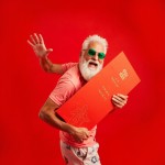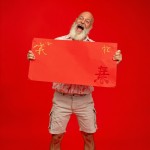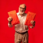 Happy White-Bearded Man Holding Large Chinese Red Envelope on Clean Red Background