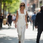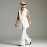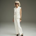 Imagine a 40-year-old woman who is highly stylish and very pretty. Hair is in an Anna Wintour bob to cheekbones with bangs. She is wearing a white westkit vest that reaches her hips. No shirt underneath. the vest is fully buttoned. pants are matching white fabric and are long and full. shoes are black, thong high heel sandals. she is wearing two large gold bangle bracelets and sunglasses
