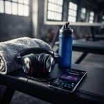 /imagine prompt: Baseus D02 Pro Wireless Bluetooth Headphones HIFI Stereo Earphones Foldable Sport Headset with Audio Cable for iPhone tablet, the headphones placed on a gym bench beside a towel and water bottle, iPhone displaying workout playlist nearby, modern gym with large windows and industrial elements in the background, energetic and empowering vibe for fitness lovers, Illustration, high-detail digital art with textured shading and sharp lighting, --ar 16:9 --v 5