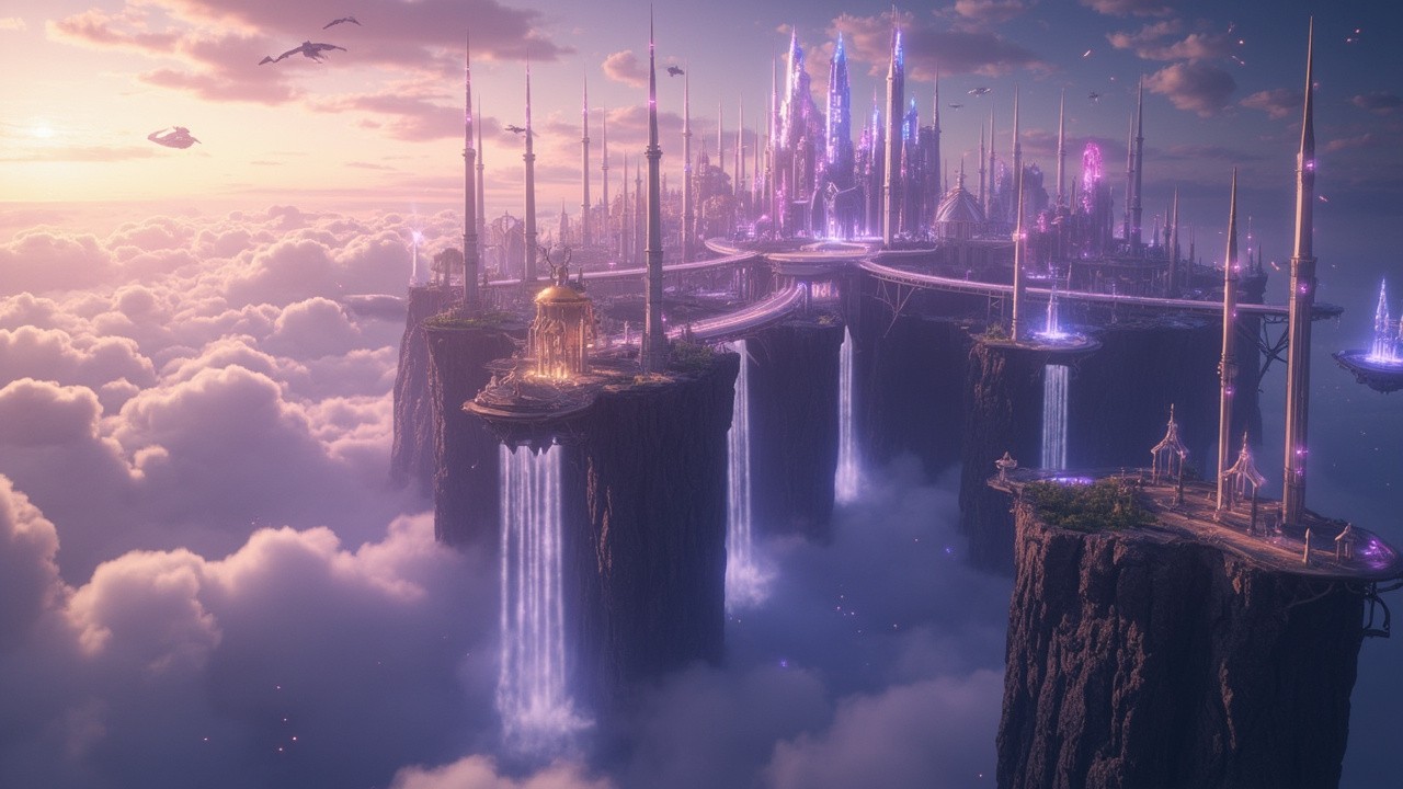 A breathtaking fantasy city floating above the clouds, built into massive cliffs and shimmering crystal spires. Elegant bridges made of light connect tall towers, with waterfalls cascading into the mist below. Elven architecture with glowing runes, curved arches, and hanging gardens. The sky is painted in soft purples and golds during sunset, with floating ships and glowing birds soaring through the air. Cinematic lighting, ultra-realistic, wide-angle shot, shot on ARRI Alexa with volumetric mist and magical light particles in the air.