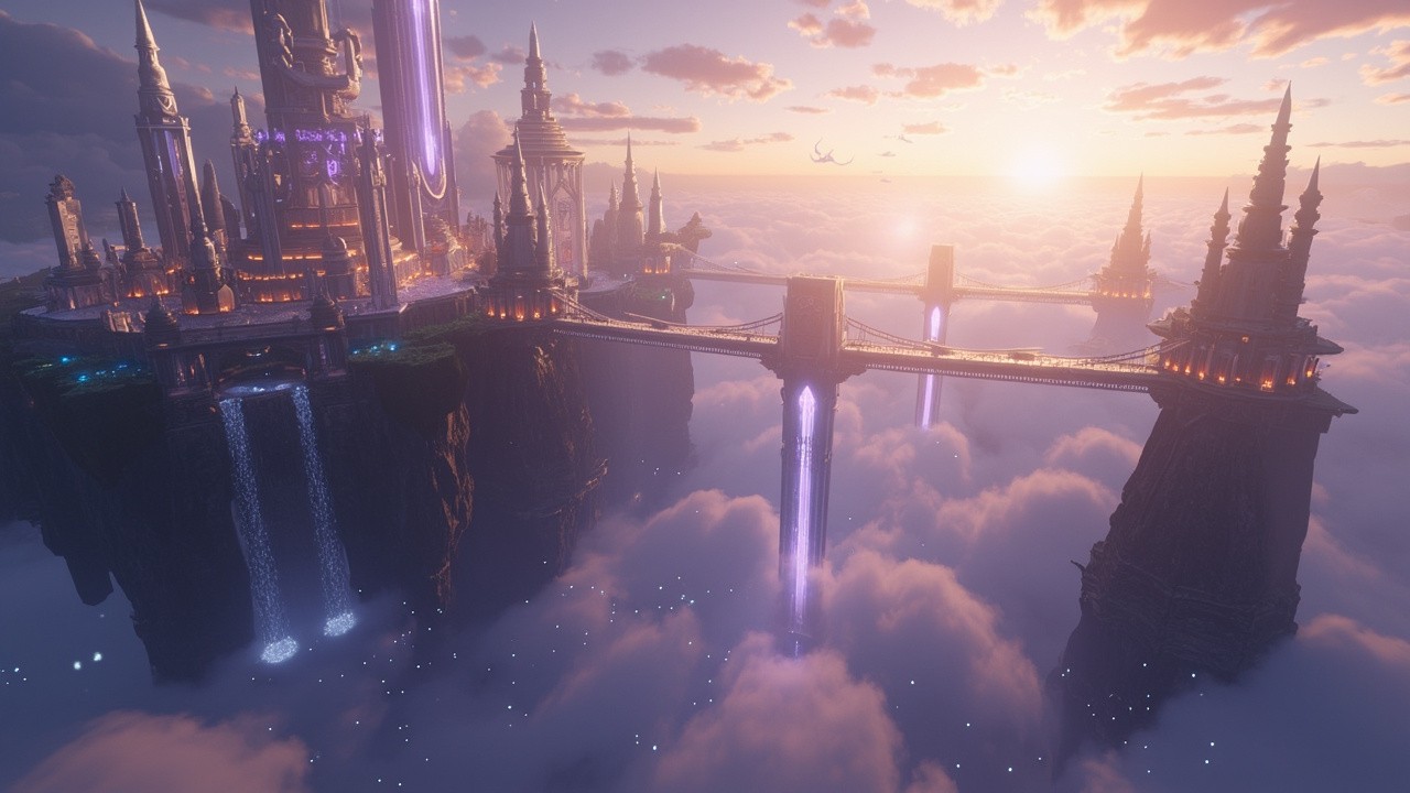 Floating Fantasy City Above Clouds with Elven Architecture at Sunset