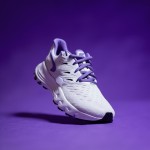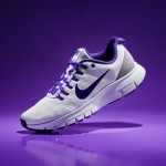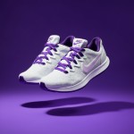 White Nike Running Shoes with Purple Details in 3/4 View on Dark Purple Background