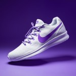 imagem hiperrealista de tênis nike corrida branco com detalhes em roxo no tenis, cadarço roxo, tenis visto em 3/4 sóo com a ponta aponhada no fundo e o calcanhar do tenis no ar e todo o fundo roxo escuro solido e vista 3/4imagem hiperrealista de tênis nike corrida branco com detalhes em roxo no tenis, cadarço roxo, tenis visto em 3/4 sóo com a ponta aponhada no fundo e o calcanhar do tenis no ar e todo o fundo roxo escuro solido e vista 3/4