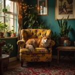 A cozy, whimsical living room with vintage boho decor, string fairy lights, and lush indoor plants. In the center, a relaxed red fox lounges elegantly on a floral-patterned mustard yellow armchair. The room features richly colored Persian rugs, framed art on deep teal walls, and warm afternoon sunlight filtering through the curtains. The fox appears calm and content, blending effortlessly into the charming and eclectic ambiance.
