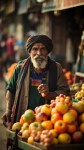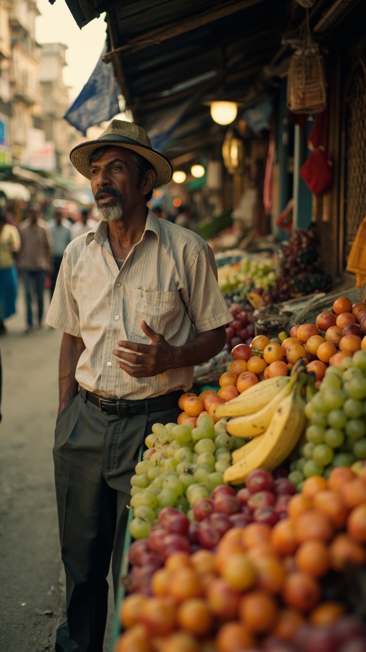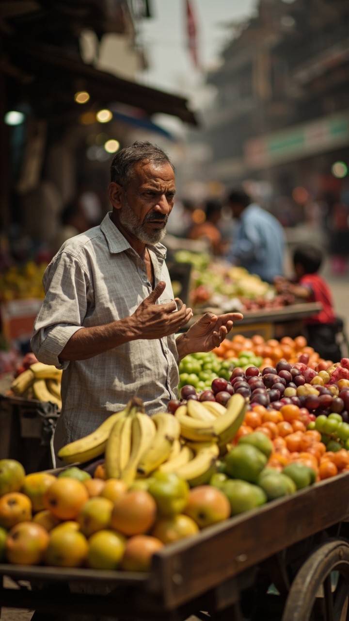 Realistic Indian street market scene, a friendly फल वाला (fruit seller) standing next to a wooden fruit cart filled with fresh colorful fruits (apples, bananas, oranges, grapes), seller mid-speech as if calling customers, expressive face, natural hand gesture, lively bazaar background, daytime natural lighting, vibrant colors, candid photography style, shallow depth of field, highly detailed, cinematic look, 4K, realistic atmosphere.