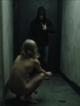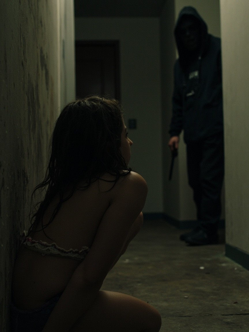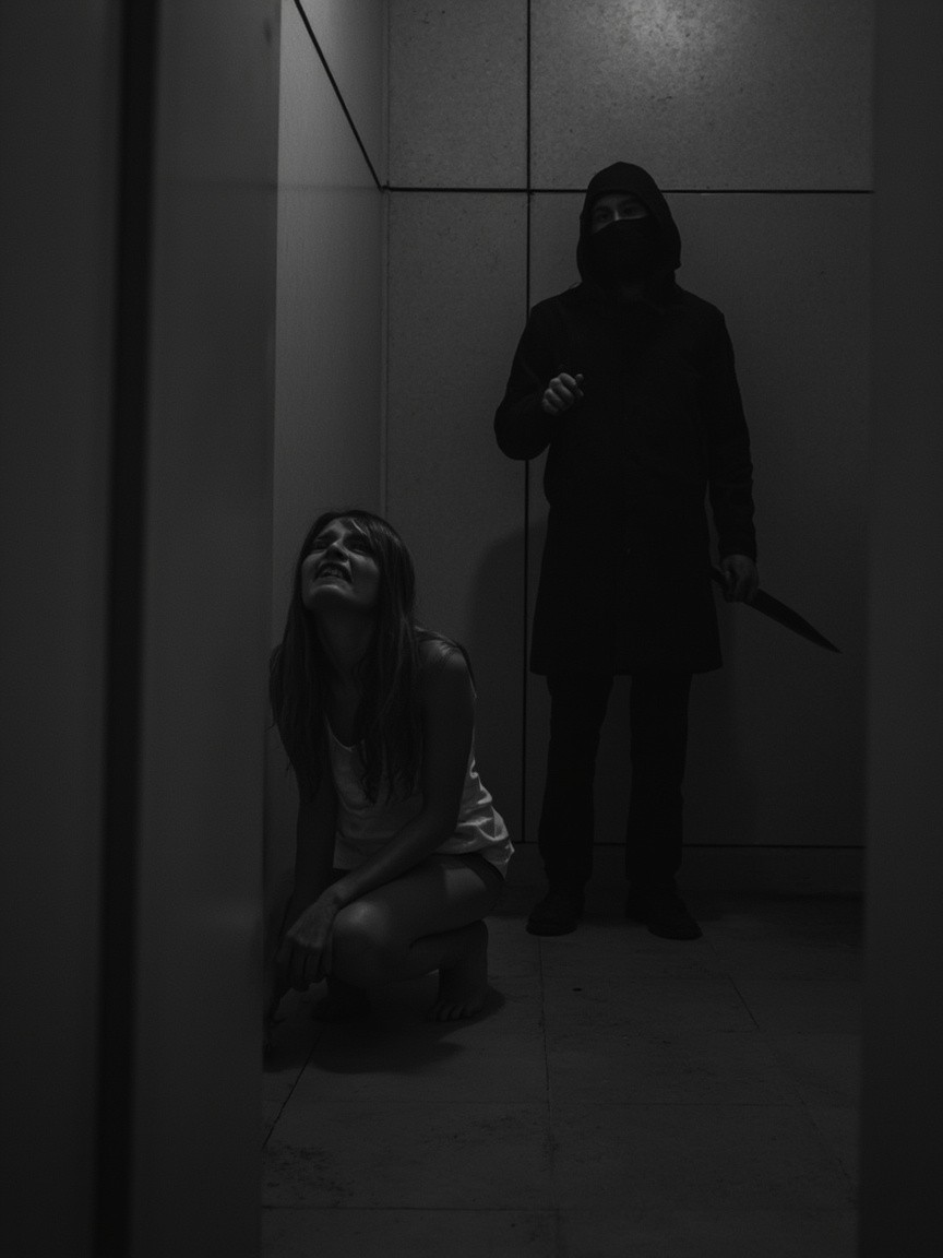 Scared Woman Crouching in Corner, Man with Knife and Hood