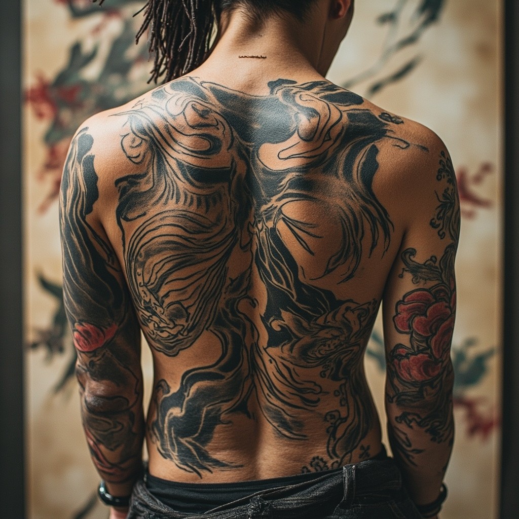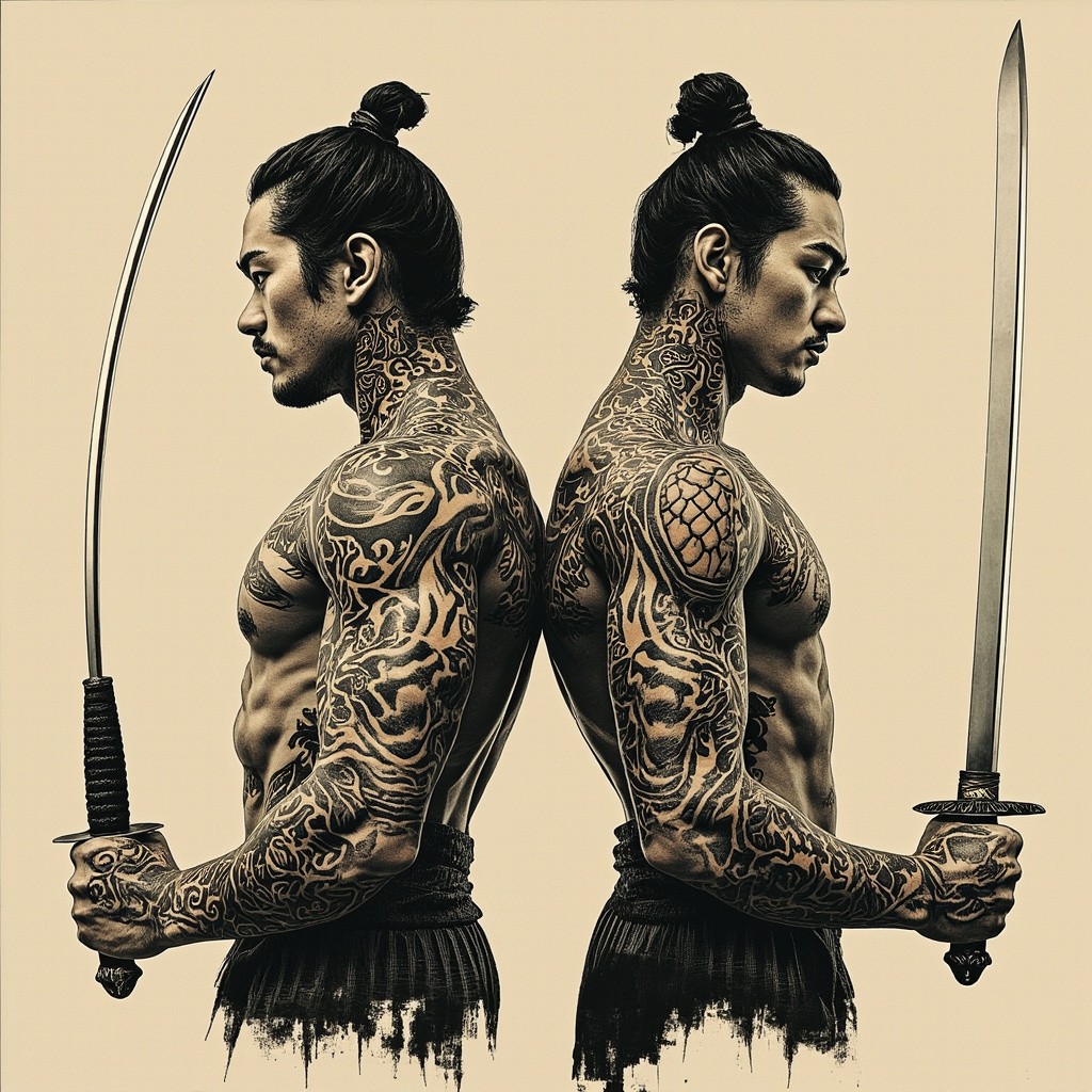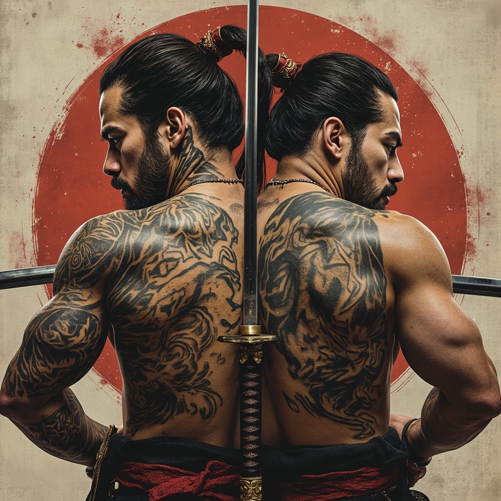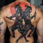Full Back Tattoo of Two Japanese Warriors with Swords Drawn