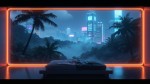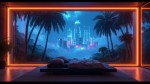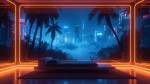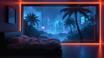 Futuristic bedroom interior at night with large panoramic glass window, sleek minimal bed facing the window, soft orange neon light outlining the window frame, view of a misty tropical forest with tall palm trees and a glowing cyberpunk city skyline in the background, skyscrapers with neon holographic billboards, dreamy blue and purple lighting, cinematic, ultra-realistic, ambient mood