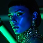 Futuristic High-Fashion Model with Metallic Blue Skin and Neon Lighting